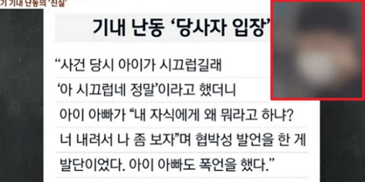 사건반장에 따르면 현재 기내 난동 당사자는 "아이가 시끄럽길래 '아 시끄럽네 정말'이라고 했더니 아이 아빠가 '내 자식에게 왜 뭐라고 하냐? 너 내려서 나 좀 보자'며 협박성 발언을 한 게 발단이었다"라며 아이 아빠가 먼저 폭언을 해 벌어진 일이라고 해명했다.