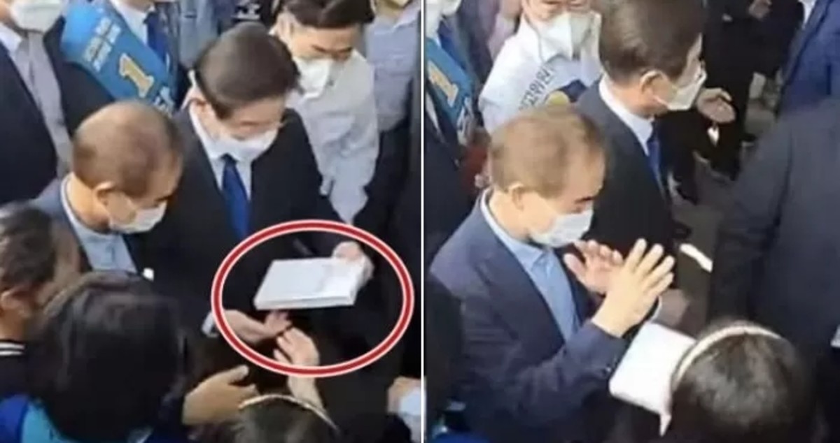 이재명 의원이 흰 표지의 책을 내밀며 사인을 요청한 여성에게 사인을 거부한 뒤 책을 돌려주는 모습 / 온라인 커뮤니티