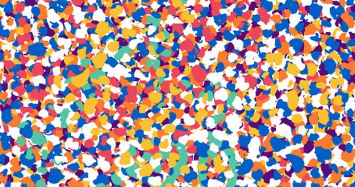 그림은 하얀색 바탕에 형형색색의 물감이 뿌려져 있다. 물방울처럼 물감을 자세히 살펴보면 숫자가 적혀 있는 것을 볼 수 있다.
