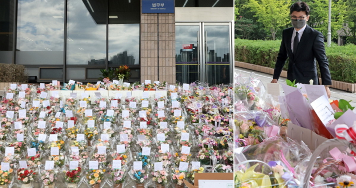 24일 경기도 과천 법무부청사 앞에 꽃바구니 200여개가 배달됐다.