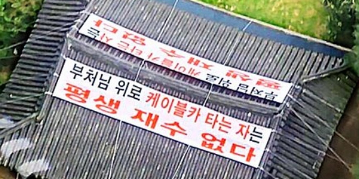 이 사찰 지붕에는 "부처님 위로 케이블카 타는 자는 평생 재수 없다"는 글귀가 적힌 대형 현수막 2개가 걸렸다.