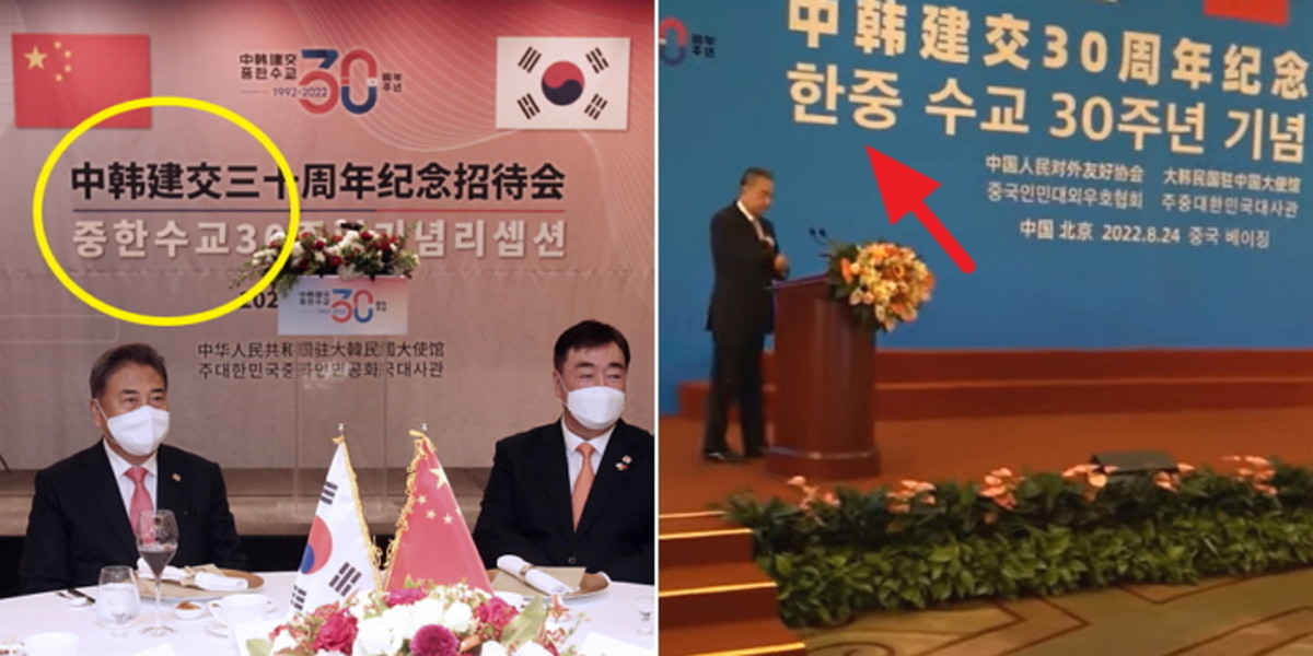 대신 한글로는 '한중수교'라고 써줬다. 한국을 앞에 두고 자국을 뒤에 뒀다. 한글을 보는 이들은 한국인들이고 또 행사에 참석한 한국인들을 배려한 차원으로 보인다.