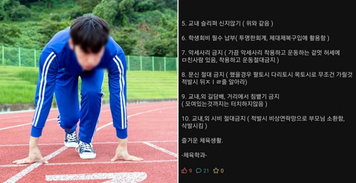 또 교내 운동복과 슬리퍼를 금지해 품위 유지를 지킬 것을 요구했다. 추가로 체대 제복이 따로 지급되는 것도 설명했다.