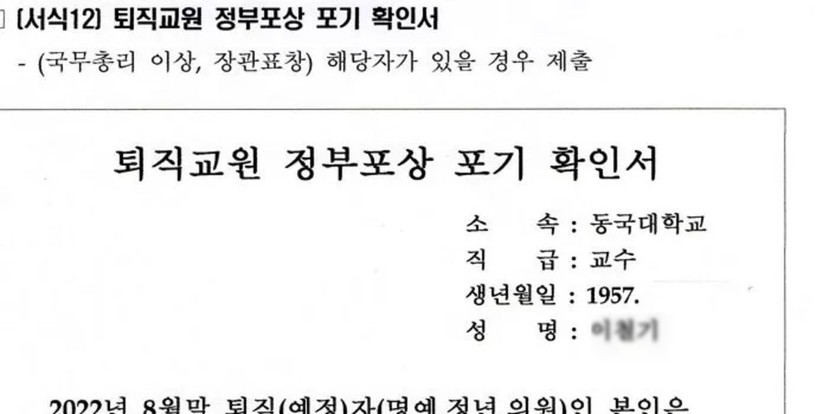 지난 27일 이 교수는 자신의 페이스북을 통해 "제가 이번 8월 말로 동국대학교를 정년퇴임하게 돼, 페북으로라도 인사를 올려야 될 것 같아 펜을 들었다"라며 정부 포상포기 확인서를 올렸다.