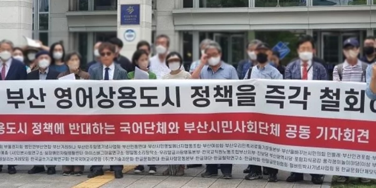 이런 정책이 알려지자, 한글문화연대 등 76개 한글 관련 단체와 부산 작가회의 등 지역 34개 시민단체가 힘을 합쳤다. 힘을 합친 단체는 29일 '부산 영어 상용도시 정책 반대 국민연합'을 결성해 부산 시청 앞에서 정책 철회를 촉구했다.