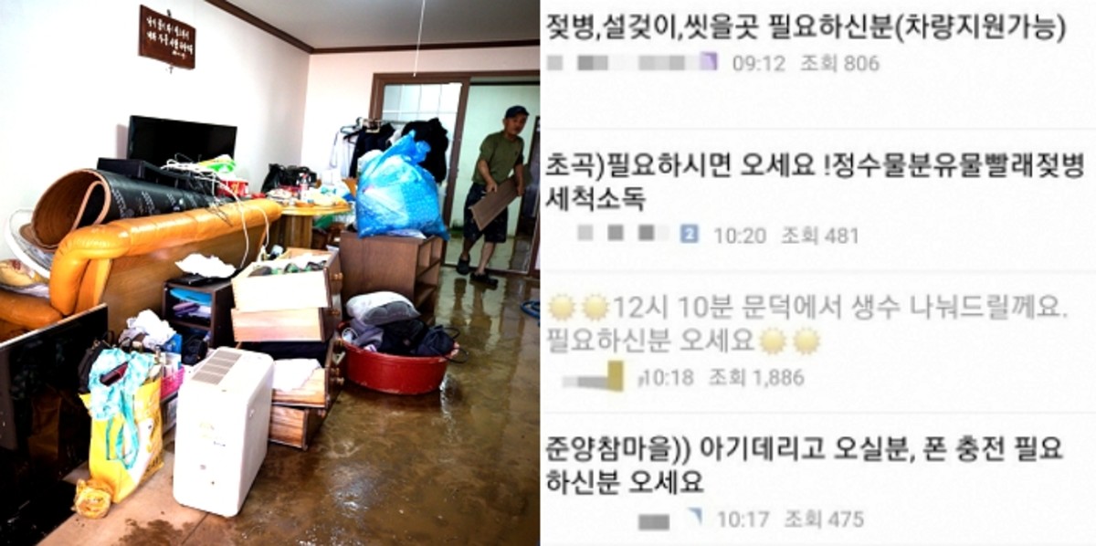 맘카페 회원들은 생수, 휴지, 물티슈, 아기용품, 아기 이유식 등 생필품 나눔부터 카시트, 제습기를 빌려주겠다는 게시글을 올렸다.