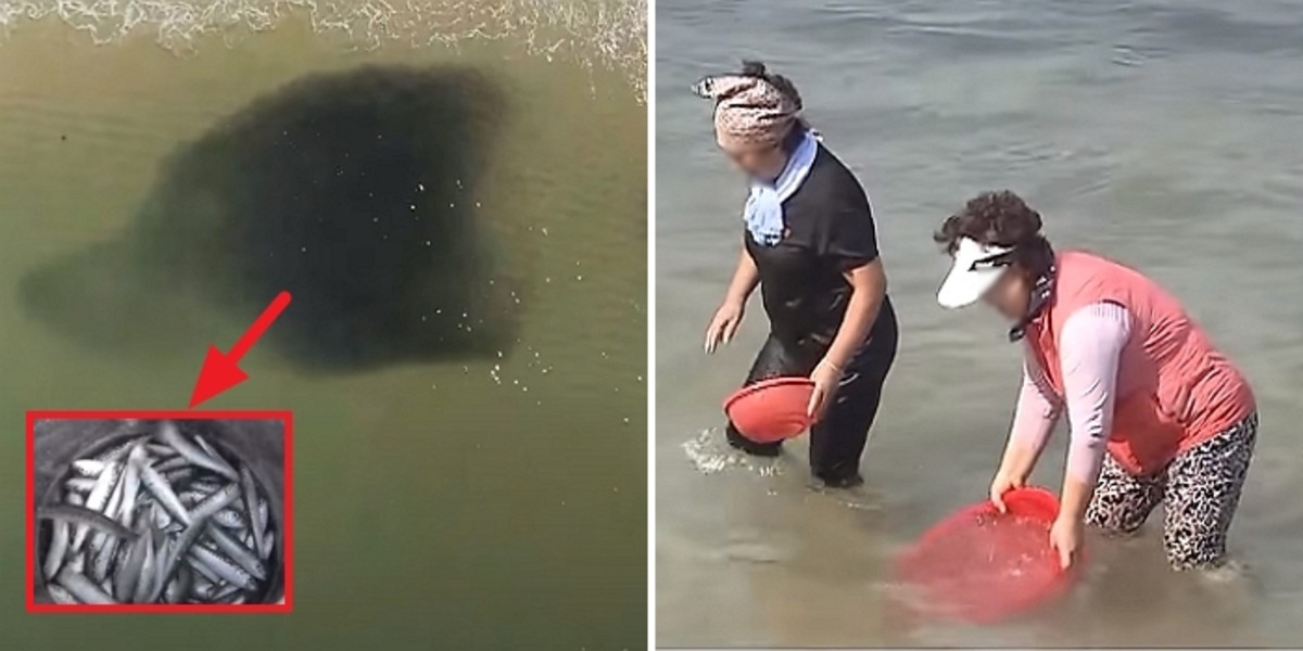 해변까지 밀려온 멸치 떼에 주민들 사이에서는 축제가 벌어졌다.