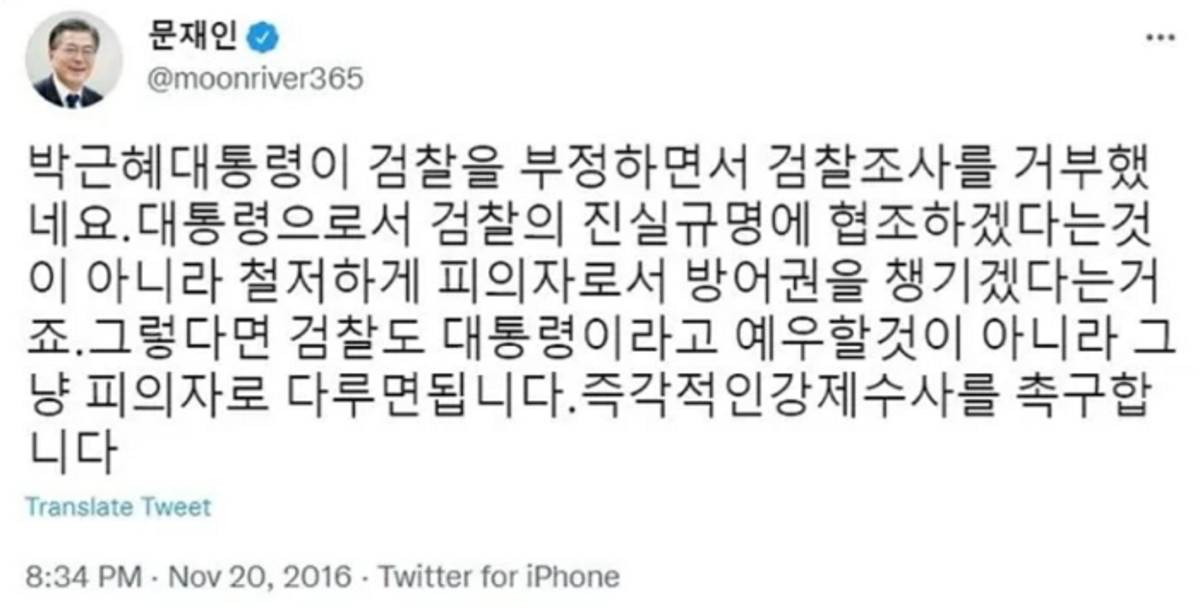 당시 문 전 대통령은 "박근혜 대통령이 검찰을 부정하면서 검찰 조사를 거부했다. 대통령으로서 검찰의 진실규명에 협조하겠다는 것이 아니라 철저하게 피의자로서 방어권을 챙기겠다는 것"이러고 비판했다.