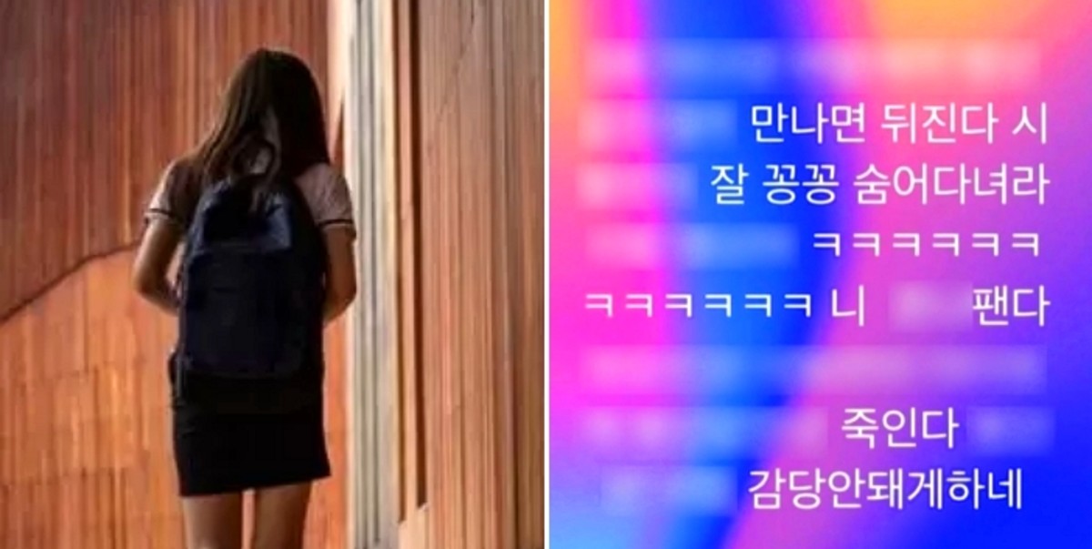 특히 B군의 여자친구는 SNS를 통해 A양에게 막말을 했다. B군의 여자친구는 "만나면 뒤진다 시X, 잘 꽁꽁 숨어 다녀라 ㅋㅋㅋ"라고 A양을 조롱하더니, 가해자에게 사과하라 요구하기까지 했다.