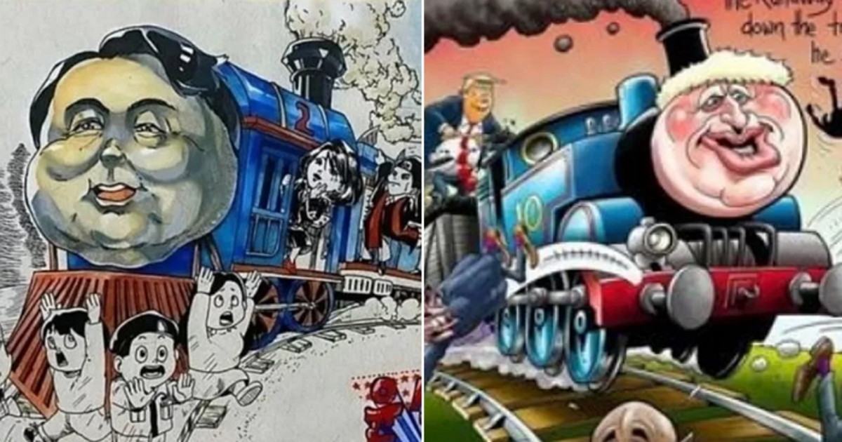 해당 일러스트에는 보리스 존슨 전 영국 총리로 추정되는 얼굴을 한 기차에서 도널드 트럼프 전 미국 대통령으로 보이는 인물이 석탄을 넣는 모습이 담겼다.