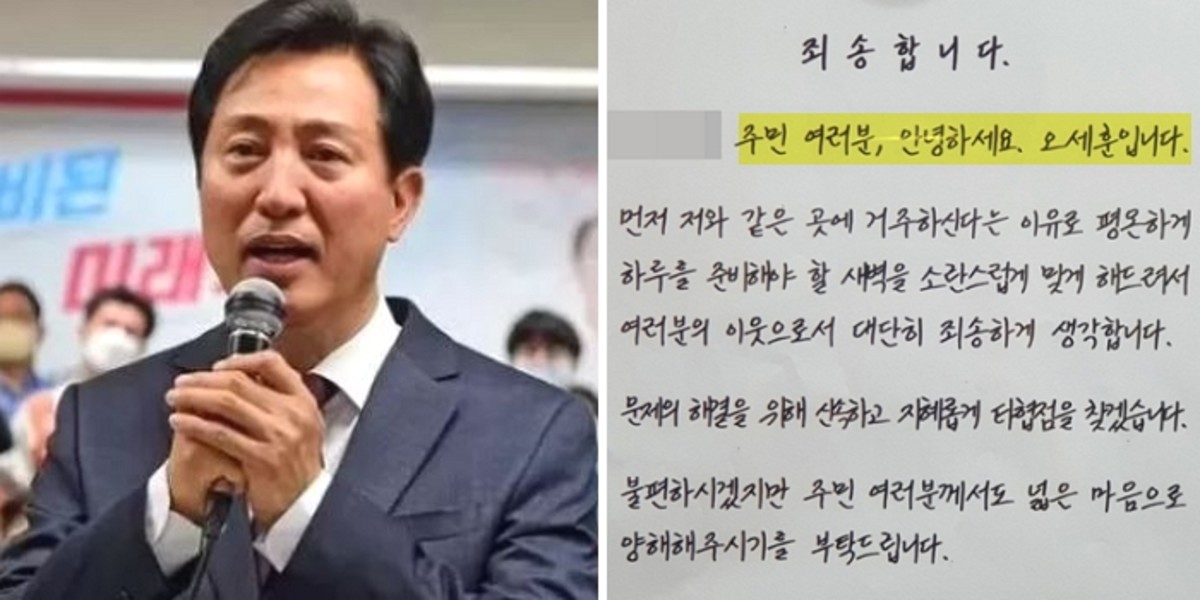 전날(13일) 뉴스1에 따르면 오 시장은 자신이 거주하는 광진구 소재의 한 아파트 게시판에 자필 사과문을 붙였다.