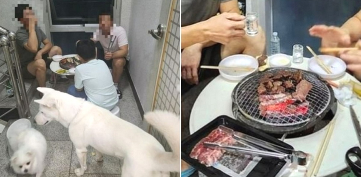 이 사진을 전한 A씨는 "밤에 시끄러운 사람 소리, '개소리'가 들려 복도로 나갔다"라며 "나가보니 사람 3명, 개 2마리가 고기를 구워 먹고 있더라"라고 말했다.