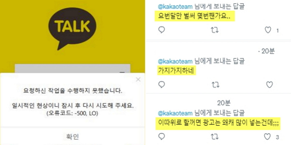 "대체 이게 몇 번째냐", "이번 서버 오류는 너무 심각한데 향후 대응은 있냐", "서버 관리는 제대로 하는 거냐", "카톡 터져여 일도 못한다" 등의 성토가 쏟아졌다.