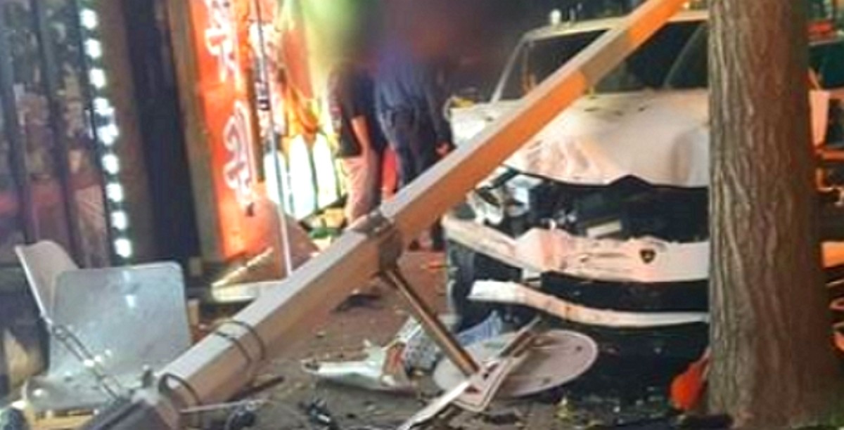 15일 오전 1시경 경기 의정부에서 흰색 람보르기니 차량이 인도를 침범해 도로 구조물 등을 들이받은 모습 / YTN