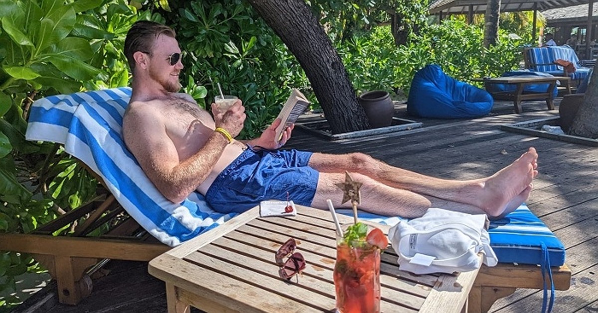 공개된 사진 속에는 햇살 좋은 날 선베드에 누워 음료를 마시며 여유롭게 책을 읽고 있는 한 남성의 모습이 담겨 있다.