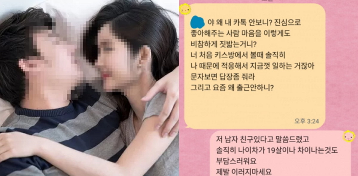 메시지에서 남성 B씨는 "왜 내 카톡 안보냐. 진심으로 좋아해 주는 사람 마음을 이렇게도 비참하게 짓밟는 거냐", "너 처음 키스방에서 볼 때 솔직히 나 때문에 적응해서 지금껏 일하는 거잖아" 등의 말을 하며 A씨를 압박한다.
