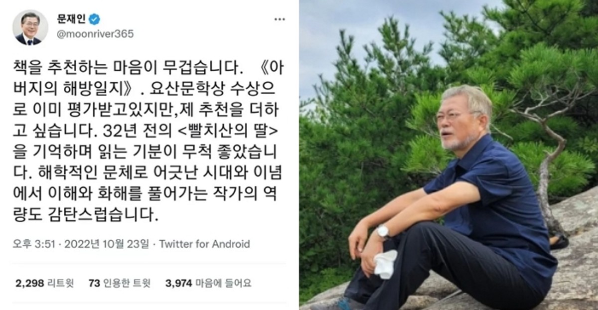 문 전 대통령은 이날 트위터를 통해 "책을 추천하는 마음이 무겁다"며 '아버지의 해방일지'라는 작품을 소개했다.