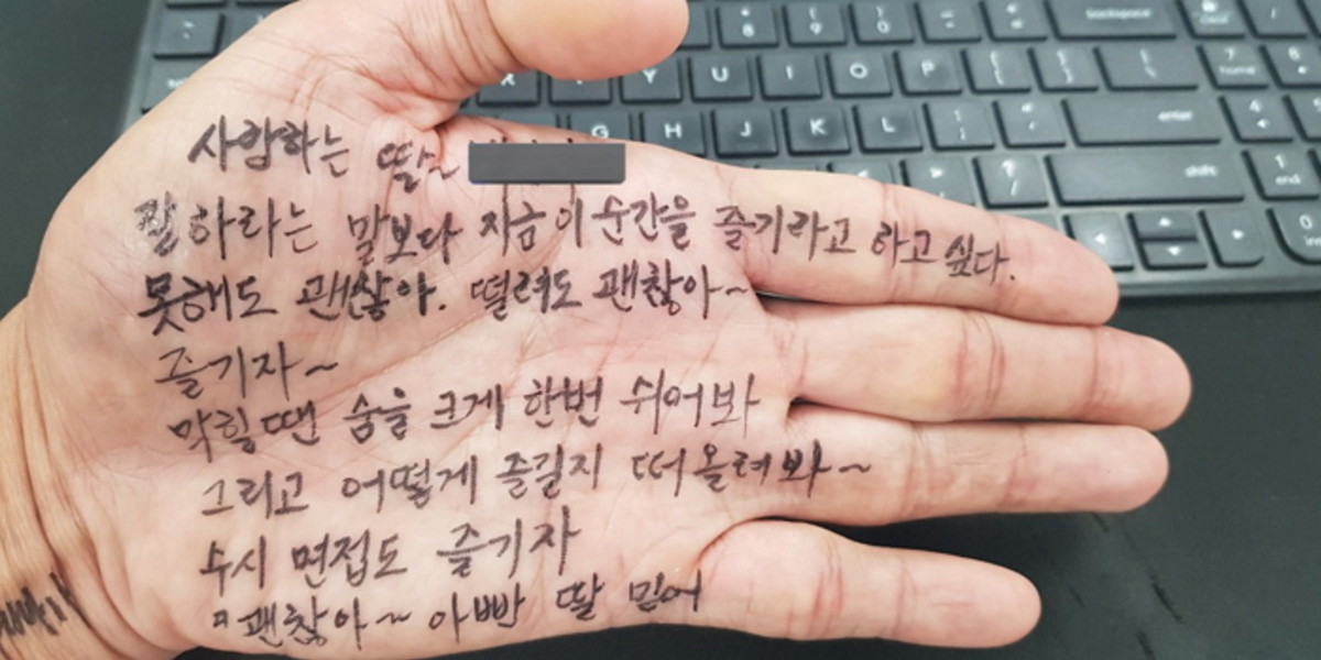 아빠는 편지에서 "사랑하는 딸, 잘 하라는 말보다 지금 이 순간을 즐기라고 하고 싶다. 못해도 괜찮아. 떨려도 괜찮아. 즐기자"라며 "막힐 땐 숨을 크게 한번 쉬어봐. 그리고 어떻게 즐길지 떠올려봐. 수시 면접도 즐기자. 괜찮아, 아빤 딸 믿어"라고 진심을 전했다.