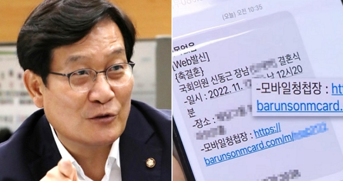 신 의원 보좌관의 번호로 주민들에게 링크를 누르면 연결되는 청첩장 문자를 보낸 것이다. 매체에 따르면 신 의원이 직접 보낸 문자도 있었다.