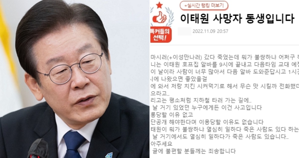 이재명 더불어민주당 대표가 최고위원 회의에서 이태원 참사 희생자의 명단과 영정을 공개하자고 주장한 어제, 희생자 유족의 글이 올라와 눈길을 끌었다.