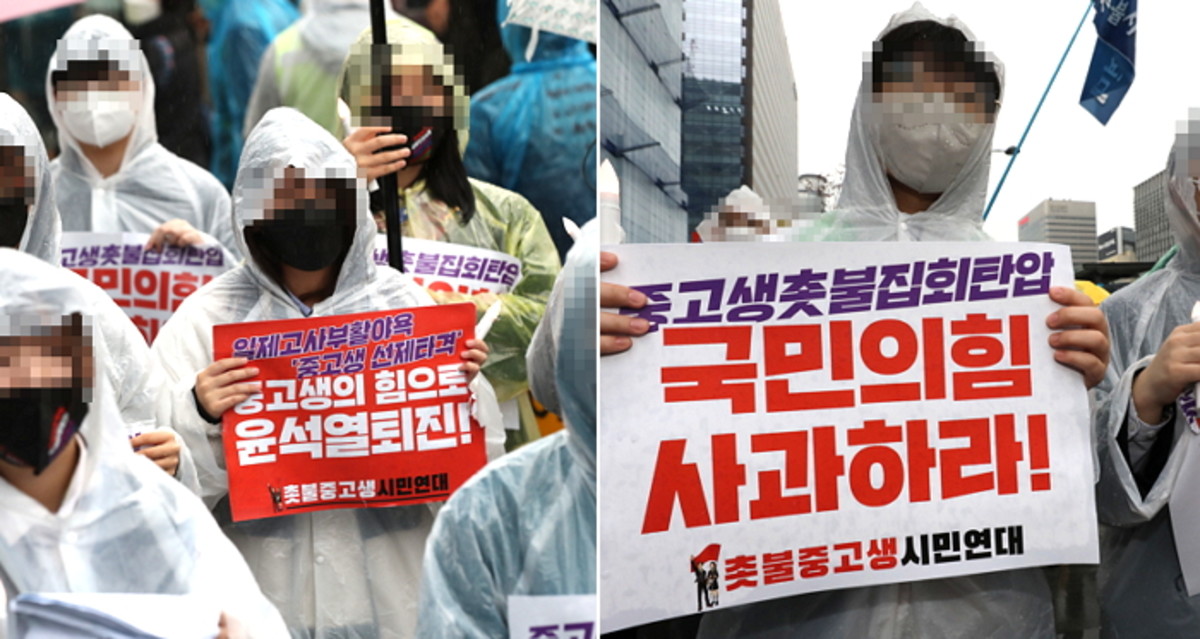비가 오는 와중에 우비를 입고 삼삼오오 모여든 학생들은 "중고생의 힘으로 윤석열 퇴진", "국민의힘 사과하라" 등의 피켓들 들고 시위를 이어갔다.