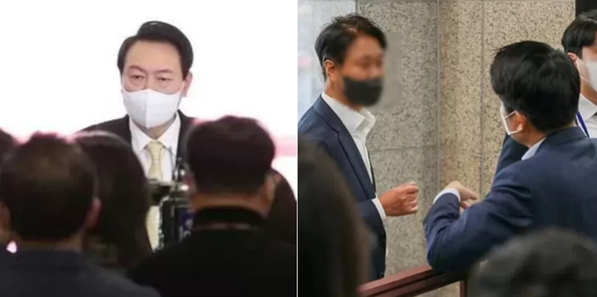 18일 용산 대통령실 청사에서 도어스테핑(약식회견) 이후 설전을 벌이는 MBC 기자(우)와 대통령실 이기정 비서(좌) / 뉴스1