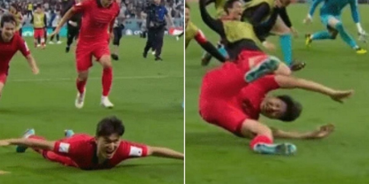 포르투갈에 승리 후 관중석을 향해 '슬라이딩 세레머니'를 선보인 대표팀...이강인은 혼자 '앞구르기'