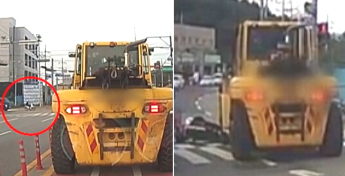 신호가 바뀌자 지게차 운전자는 좌회전을 시작했다. 그런데 중앙선을 침범해 유도선을 무시하고 좌회전을 하는 것 아닌가.