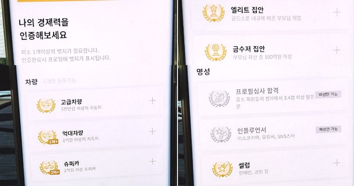 슈퍼카·수입차 인증하기, 고급아파트(네이버부동산 시세 기준 20억 이상) 인증하기, 전문직(판사, 의사, 변호사, 5급 공무원 등) 인증하기, 고소득(30대 7천만원 이상) 인증하기, 엘리트 집안 인증하기 등이다.