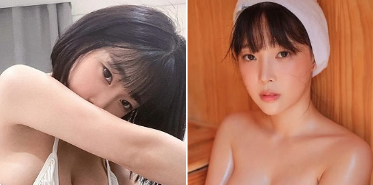 사진 속 강인경은 몸에 실오라기 하나 안 걸친 채 붉은 리본을 늘어뜨렸다.