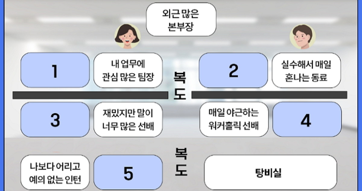 4번은 매일 야근하는 워커홀릭 선배 옆자리다. 다만 앞자리에 실수해서 매일 혼나는 동료가 있다.