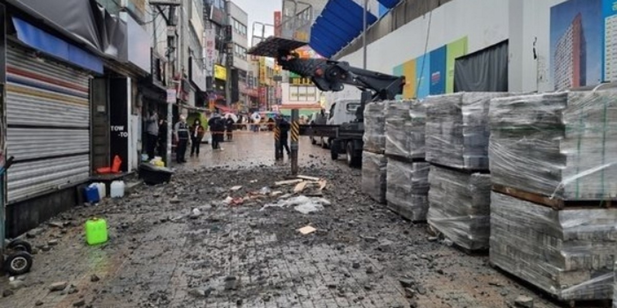15일 소방당국 등에 따르면 이날 오전 8시 32분께 부산 중구 남포동 한 숙박시설 신축공사 현장에서 1.3t가량의 벽돌 더미가 15층 높이의 타워 크레인에서 떨어졌다.