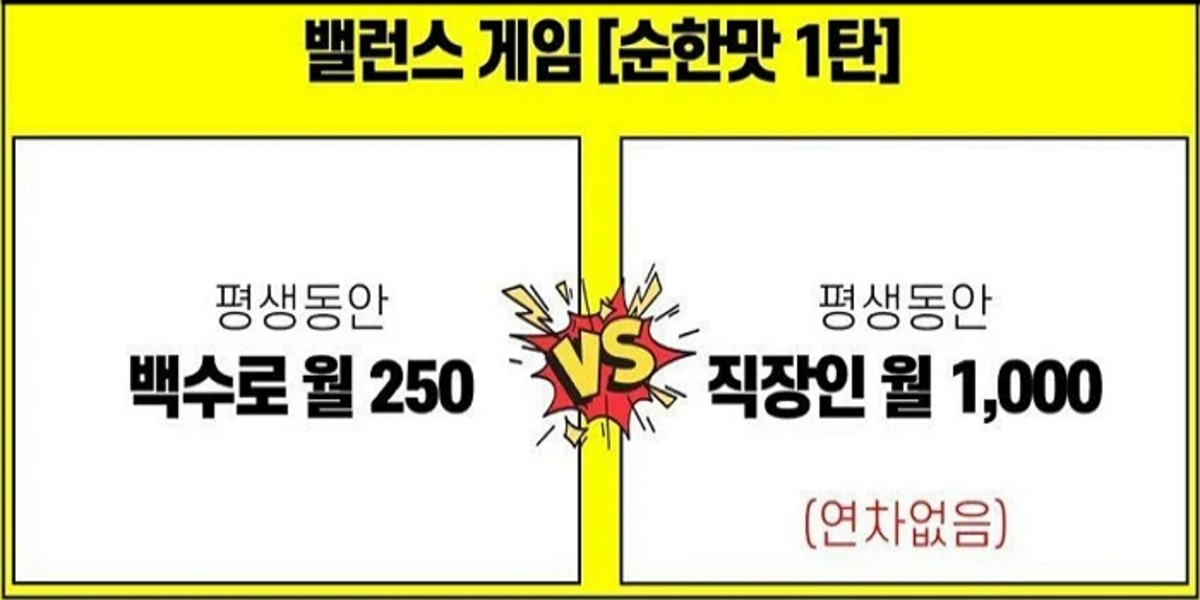 최근 온라인 커뮤니티 더쿠에는 "백수로 월 250 vs 직장인으로 월 1000"이라는 제목으로 밸런스 게임이 올라와 누리꾼들의 폭발적인 관심을 받았다.