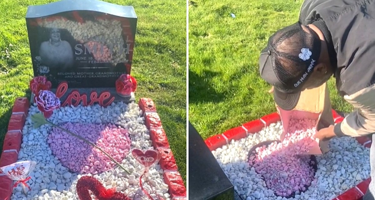 남성은 핑크색 돌로 새롭게 하트를 채웠고 다른 장식품들을 배치해 멋진 무덤 인테리어를 완성시킨다.