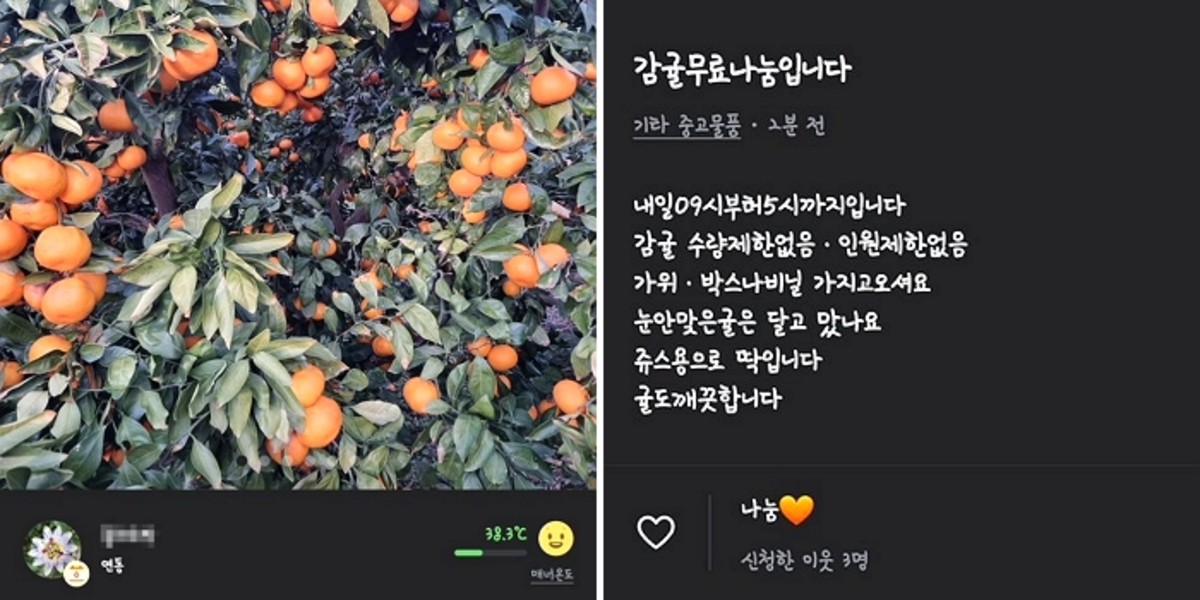 해당 글에서 작성자 A씨는 "감귤을 무료 나눔 한다"라며 "가위나 비닐을 가지고 오면 된다"라고 공지했다.