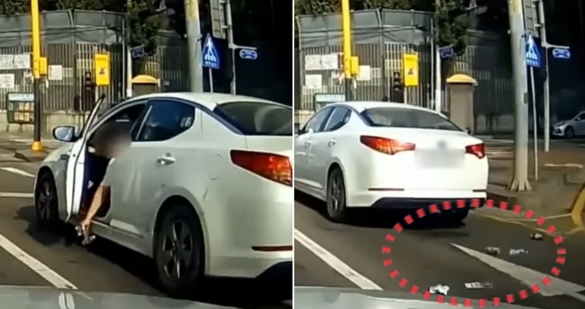해당 영상을 보면 오른쪽 앞에 위치한 하얀색 차량 운전자는 자연스럽게 차 문을 열고 2차례 쓰레기를 버린다.