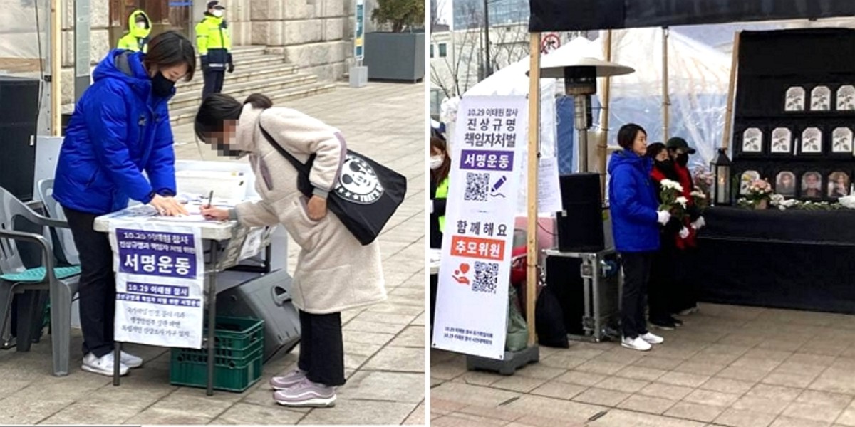 사진 속 파란색 점퍼를 입은 고 의원은 '10.29 이태원 참사 진상규명과 책임자 처벌 위한 서명운동' 업무를 돕고 있었다.
