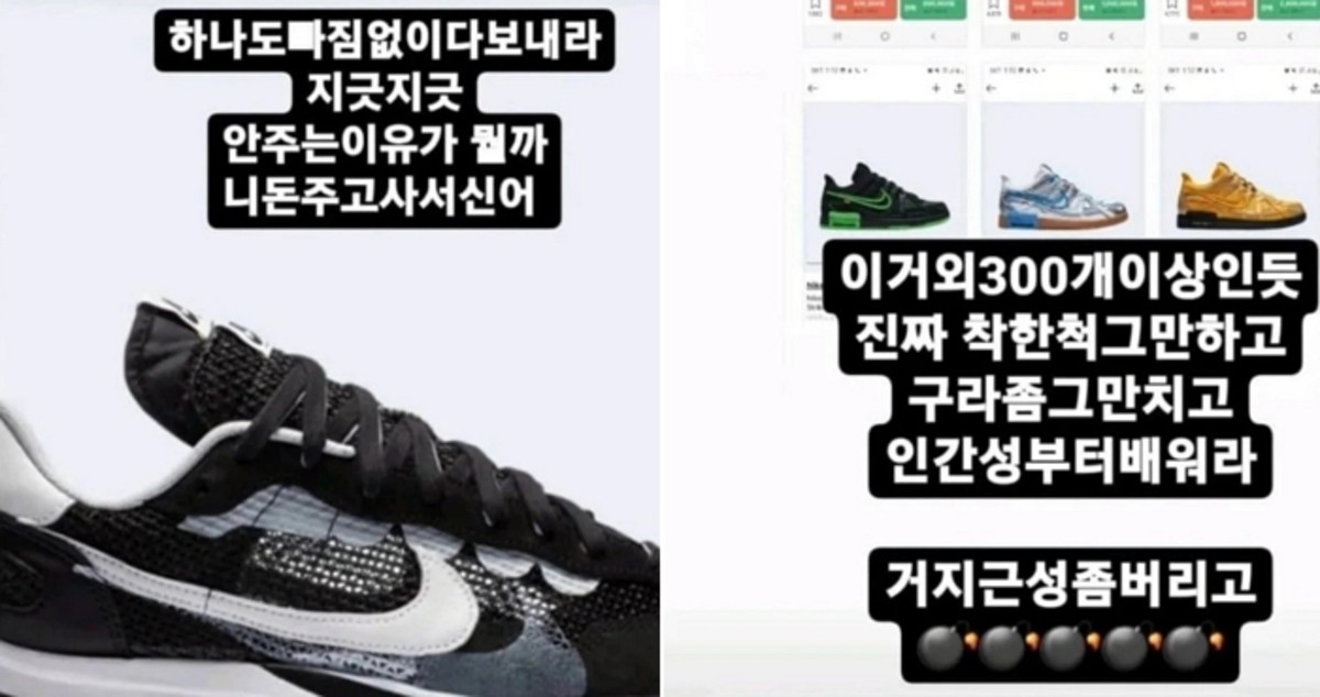 최근 여러 온라인 커뮤니티에 공개된 바에 따르면 스타일리스트 A씨는 자신이 나이키 운동화 사진을 여러 장 게재하며 주어가 없는 '저격 글'을 게재했다.