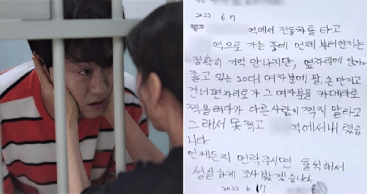 각서에는 삐뚤빼뚤한 글씨로 "정확히 기억 안 나지만, 옆자리에 앉아서 졸고 있는 20대 여자분의 팔, 손을 만지고 건너편 자리로 가 그 여자분을 카메라로 찍으려 했다"는 내용이 담겼다.