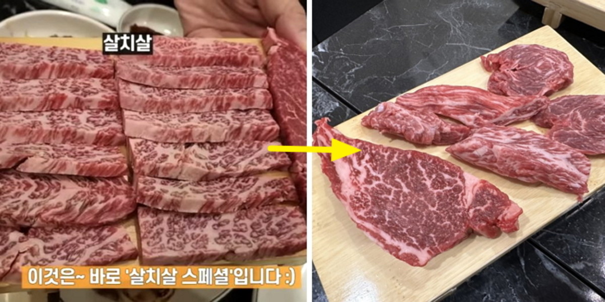 그는 "당연히 연예인이 와서 영상 찍는 수준의 고기가 나올 거라는 생각은 안 했습니다만, 너무 차이가 많이 나서 현타가 크게 왔네요"라며 자신이 받은 고기와 유튜브 영상에 나왔던 고기 영상 캡처본을 비교해 올려뒀다.