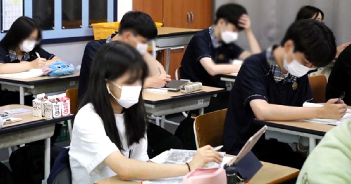 교실에서 마스크로 얼굴 꽁꽁 숨기는 10대