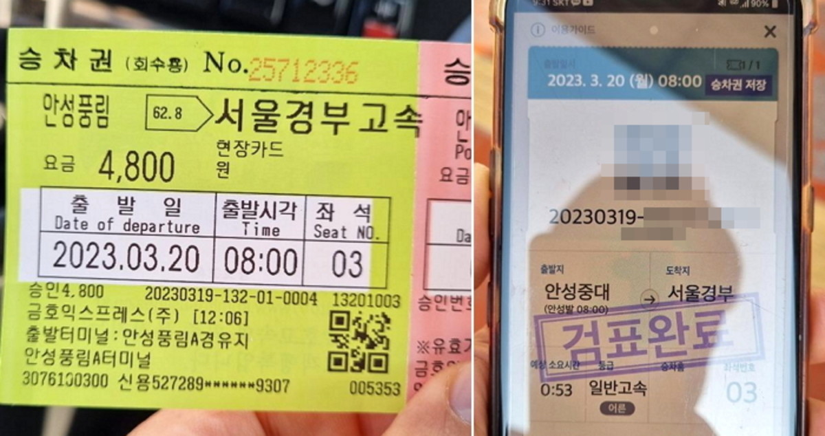 자신을 고속버스 기사라고 소개한 A씨는 "어제(20일) 안성에 있는 모 아파트 정류장에서 있던 일"이라며 두 장의 승차권 사진을 공개했다.