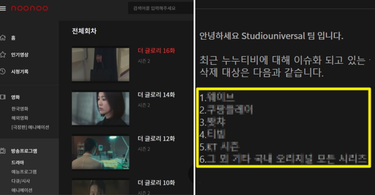 누누티비 측은 "최근 누누티비에 대해 이슈가 된 국내 OTT 오리지널 시리즈와 관련한 모든 동영상을 일괄 삭제할 예정"이라며 삭제될 자료를 명시했다.