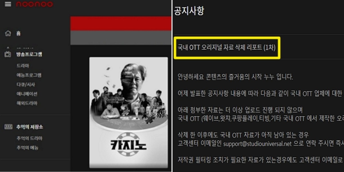 이와 더불어 누누티비 측은 공지사항을 통해 "국내 OOT 오리지널 자료 삭제 리포트(1차)"를 발표했다.