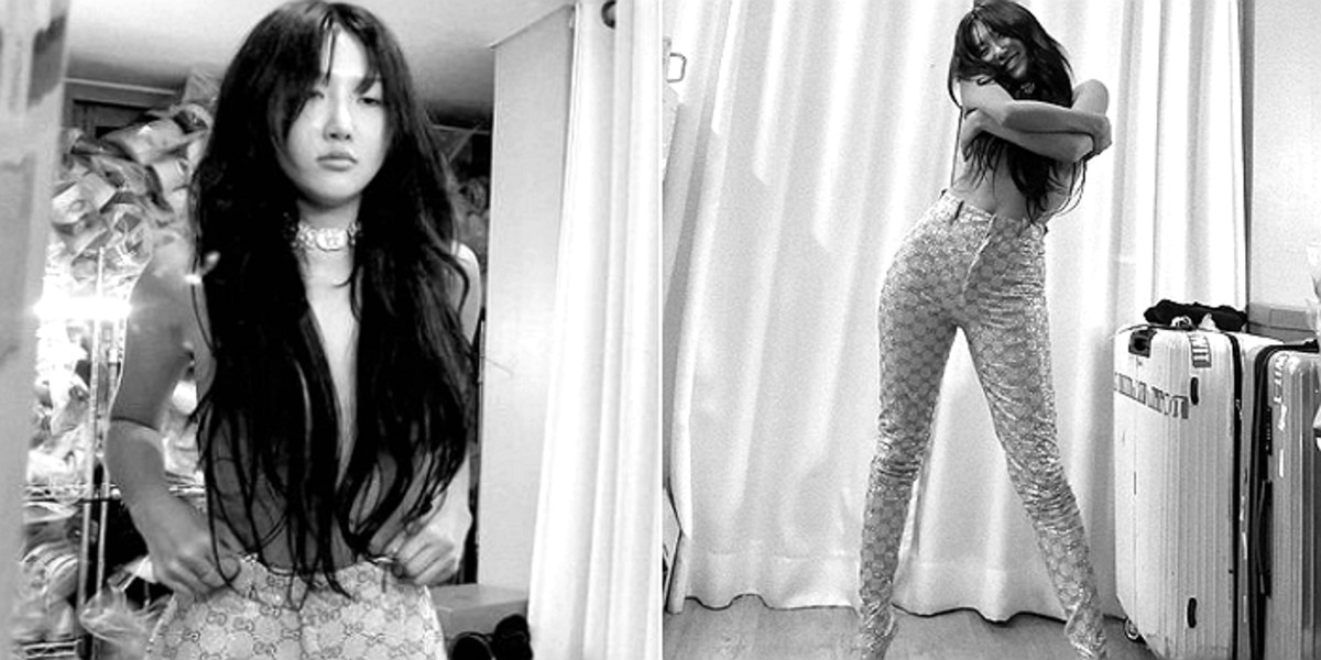 사진 속 화사는 배꼽까지 오는 길이의 하이웨이스트(high-waist) 바지를 입은 채 역동적인 자세를 취하고 있었다.