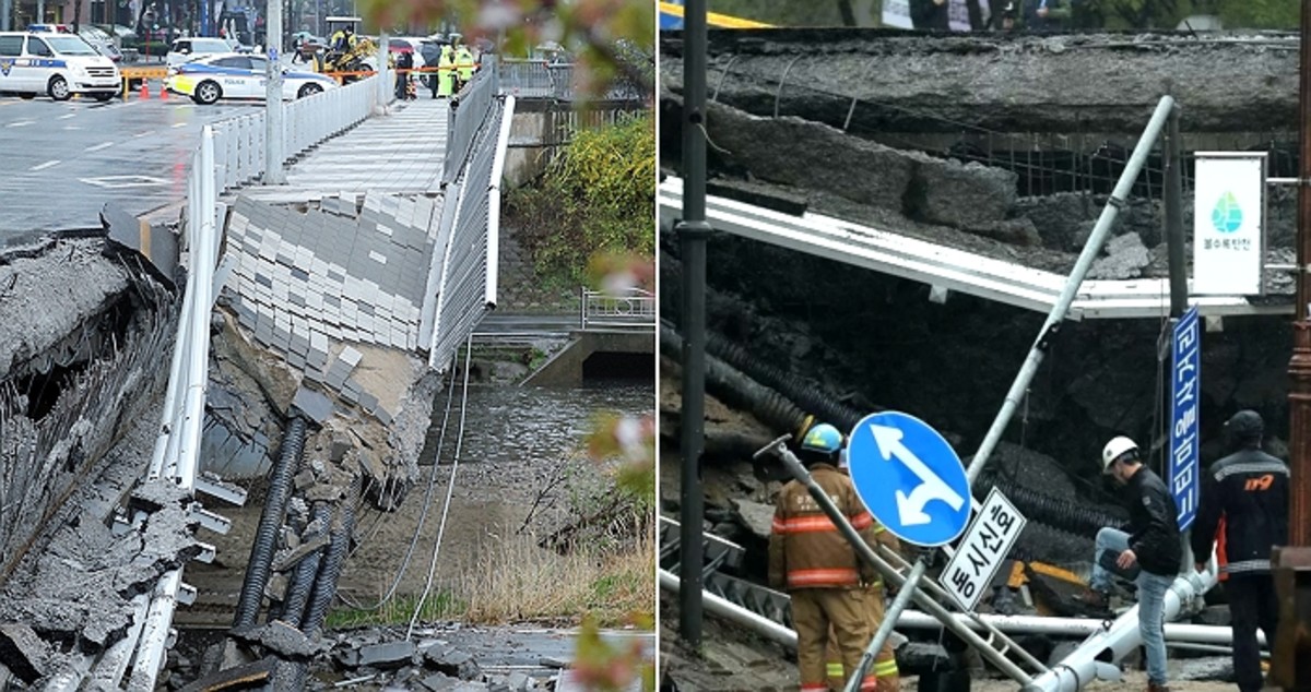 보행로는 흔적을 찾아볼 수 없을 정도로 주저앉았고, 틈 사이로 철근 골조가 그대로 나타났다.