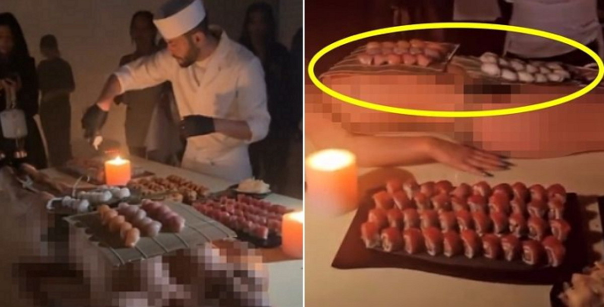 초밥이 올라간 접시는 여성의 중요 부위를 아슬아슬하게 가렸고, 여성은 눈을 뜨고 허공을 응시한 채 가만히 있었다. 파티에 참석한 이들은 흥미로운 듯 연신 사진을 찍고 구경했다.