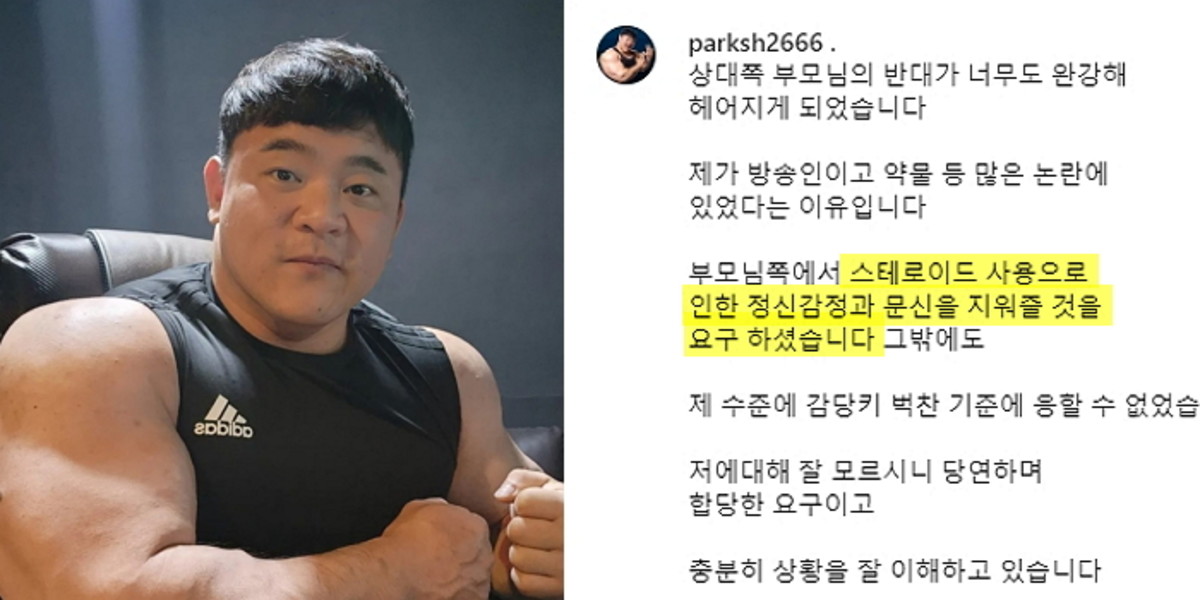 박승현은 "(상대) 부모님은 스테로이드 사용으로 인한 정신감정과 문신을 지워달라고 요구했다"라며 "그밖에 제 수준에 감당하기 어려운 벅찬 기준에 응할 수 없었다"라고 말했다.