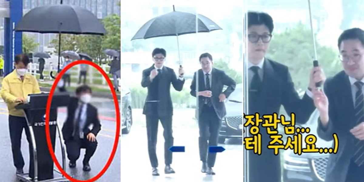 한 장관은 이때 스스로 우산을 들고 걸었다. 왼쪽에 서 있던 누군가가 계속적으로 우산을 들려 했지만, 한 장관은 에스코트 받지 않고 스스로 우산을 들었다. 그리고 함께 걷던 이를 보호하기 위해 우산을 함께 썼다.