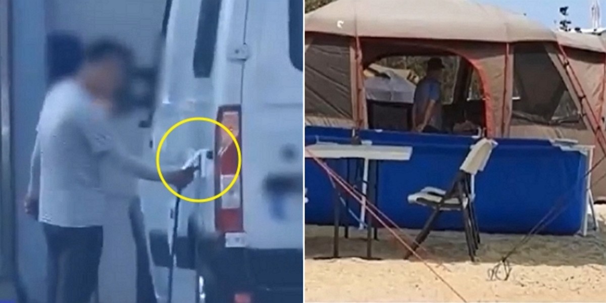 공개된 영상에는 해변에 있는 공영주차장 화장실 건물 앞에 주차해 놓고 물을 끌어가는 캠핑카의 모습이 담겼다.